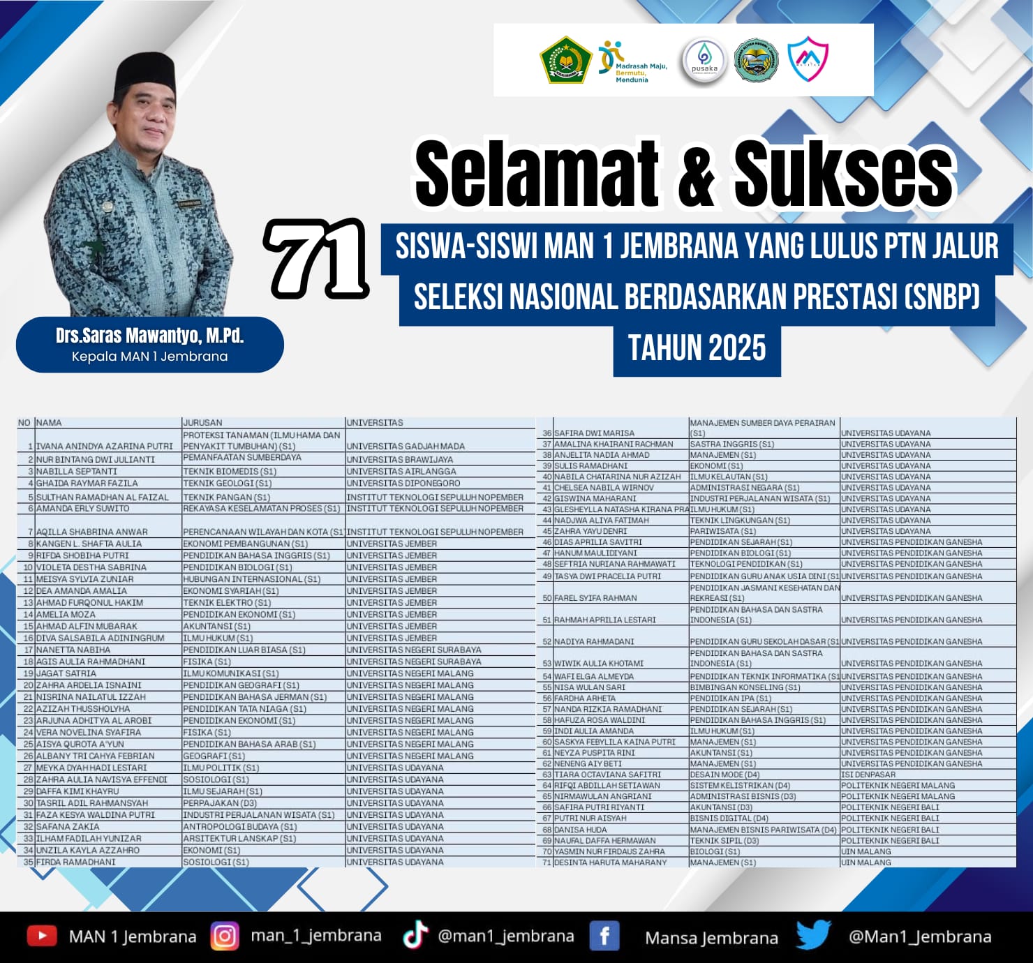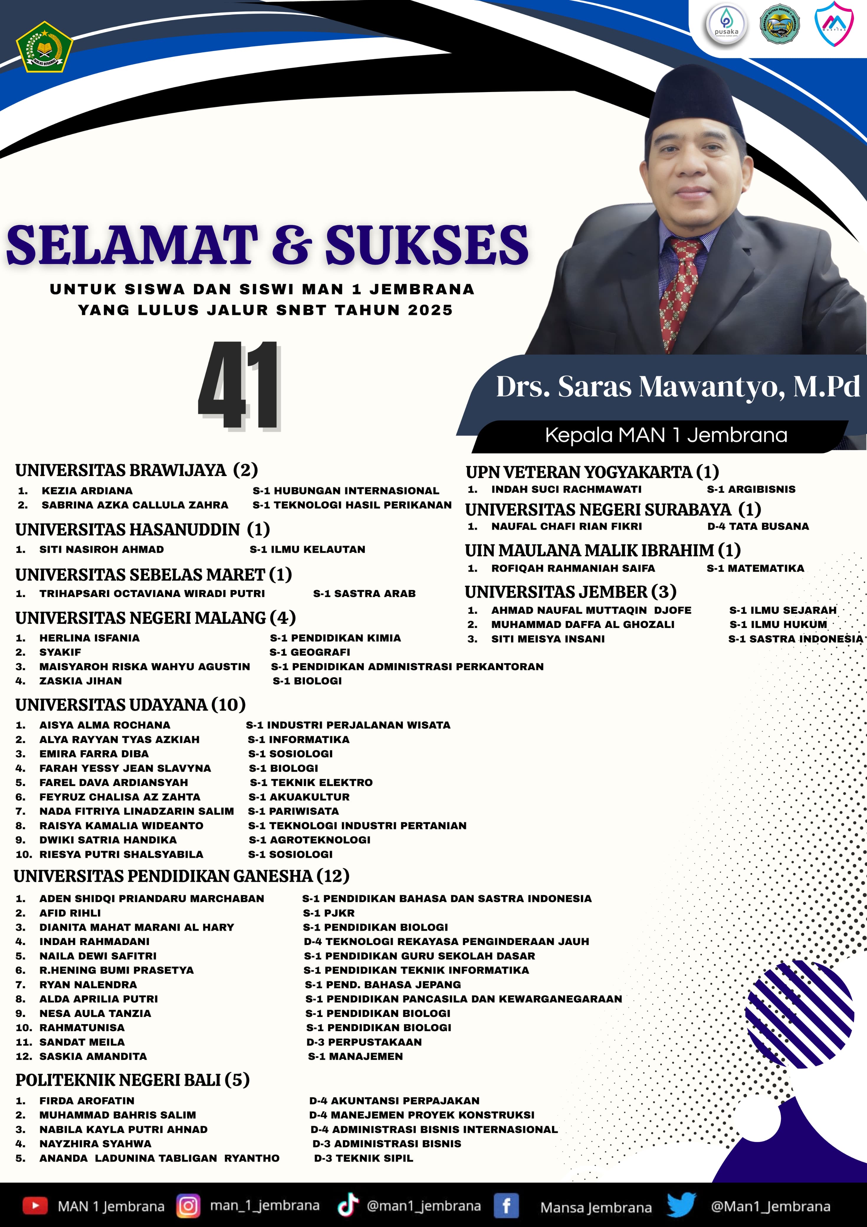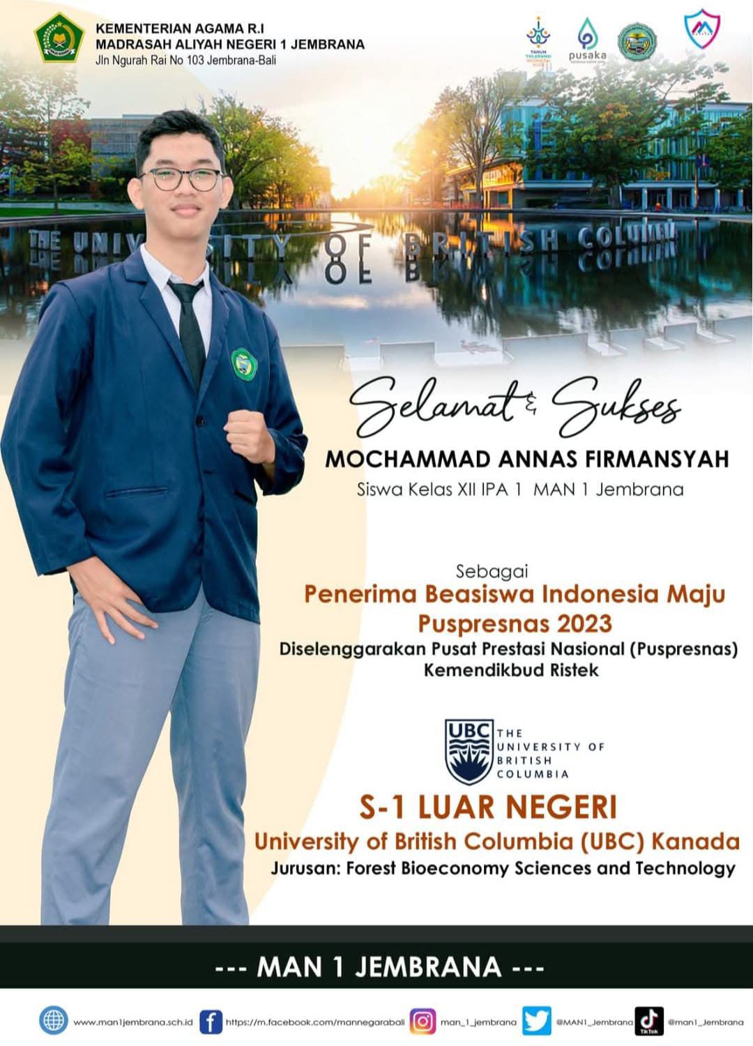 Dengan bekal ilmu dan karakter unggul, lulusan MAN 1 Jembrana berhasil melanjutkan studi di perguruan tinggi bergengsi dan membangun karier di berbagai bidang profesional.