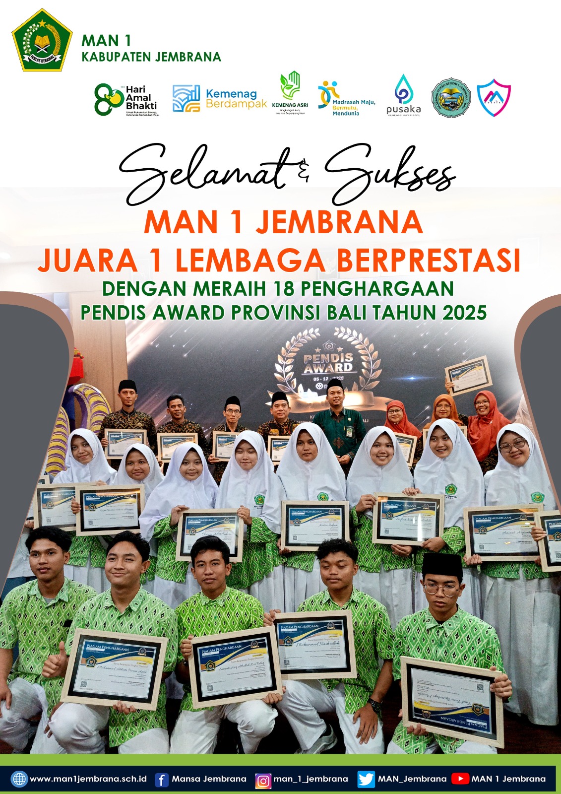 Pada kesempatan bergengsi ini, MAN 1 Jembrana berhasil meraih Juara 1 sebagai Lembaga Berprestasi jenjang Madrasah Aliyah. Penghargaan tersebut semakin istimewa karena MAN 1 Jembrana berhasil mengumpulkan total 18 penghargaan, menjadikannya lembaga dengan perolehan prestasi terbanyak pada Pendis Award Provinsi Bali Tahun 2025.