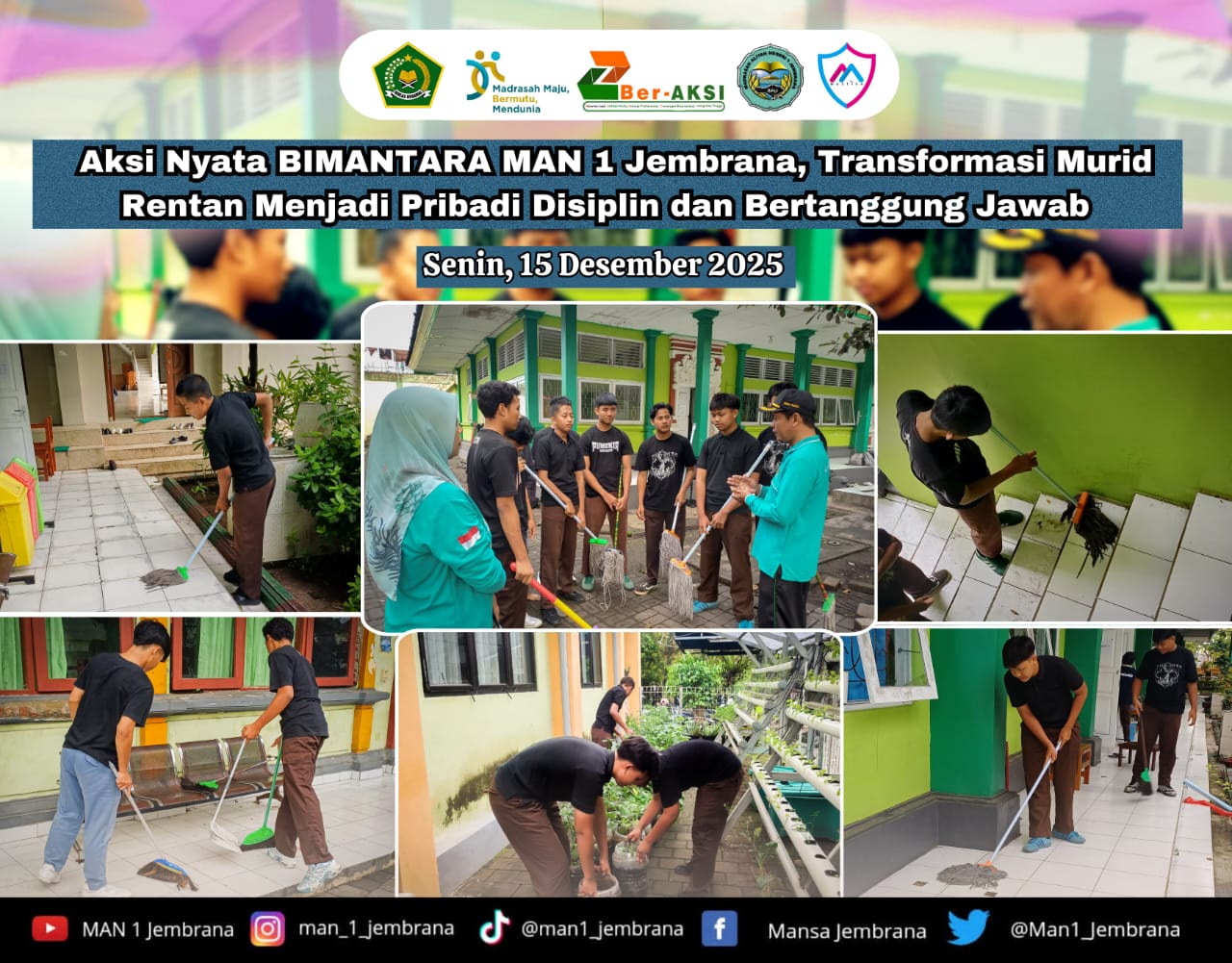 Pada Senin, 15 Desember 2025, MAN 1 Jembrana terus meneguhkan perannya dalam pembinaan karakter peserta didik melalui program BIMANTARA (Bimbingan Anak Hebat dan Istimewa). Program ini menjadi ruang pendampingan bagi murid yang membutuhkan perhatian khusus dalam penguatan karakter, sikap, dan kepercayaan diri, sekaligus sebagai upaya mengikis stigma negatif melalui pembinaan berkelanjutan. Kegiatan diawali dengan aksi kebersihan lingkungan madrasah, siswa membersihkan area-area yang jarang tersentuh seperti selasar, sudut bangunan, serta lingkungan sekitar kelas. Aktivitas ini menjadi media pembelajaran karakter yang menanamkan nilai disiplin, tanggung jawab, kerja sama, dan kepedulian terhadap lingkungan, sekaligus selaras dengan implementasi Zona Integritas dalam membangun budaya bersih, tertib, dan berkarakter.